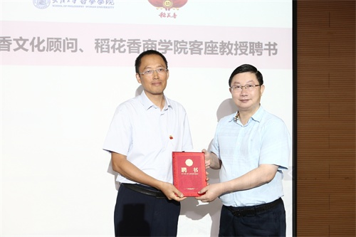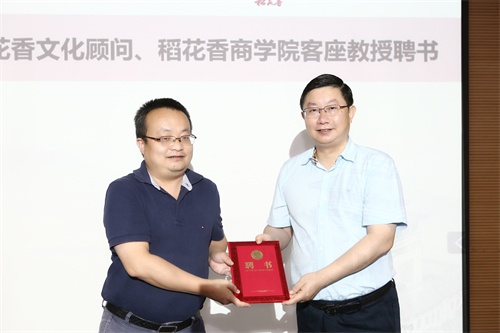 蔡開(kāi)雲(右)為(wèi)劉林(lín)青(左)頒發“稻花(huā)香商學院客座教授”聘書(shū)