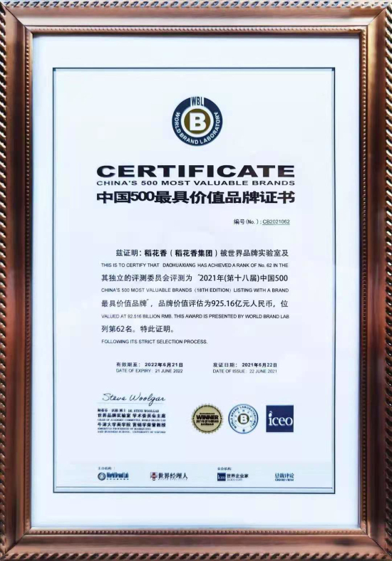 【概要(yào)描述】6月(yuè)22日(rì),以“可(kě)持續品牌助推公司增長(cháng)”為(wèi)主題的(de)第十八屆世界品牌大(dà)會(huì)在北(běi☆)京舉行(xíng),會(huì)上(shàng)發布了(le)中國(guó)500最具價值品牌榜單。稻花(huā)✘香以925.16億元的(de)品牌價值連續18年(nián)上(shàng)榜,位居總榜單第62位、食品飲料行(xíng)<業(yè)前十強、白(bái)酒行(xíng)業(yè)第四位,品牌價值較去(qù)年(nián)增長(cháng)119.3億元。