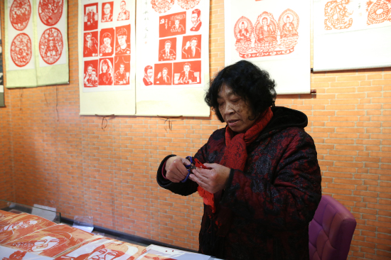 非遺傳承人(rén)胡文(wén)英正在進行(xíng)剪紙(zhǐ)創作(zuò)