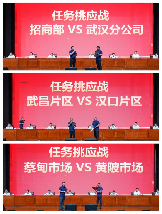 “2024,自(zì)我加壓、競争拼搶,招商部力争1200萬,向武漢分(fēn)公司發起挑戰!”“你(nǐ)敢挑我敢戰↕。武漢确保8200萬、力争8800萬,我接受你(nǐ)的(de)挑戰”,挑應戰環節中,招商部經理(lǐ)李小(xiǎo)松帶頭向武漢分(fēn✔)公司經理(lǐ)郭勝發起挑戰。分(fēn)公司之間(jiān)比業(yè)績,市(shì)場(chǎng)之間(jiāαn)拼目标,經銷商之間(jiān)較量志(zhì)氣和(hé)信心。“東(dōng)風(fēng)吹、Ω戰鼓擂,武昌任務怕過誰”“拼業(yè)績、搶市(shì)場(chǎng),漢口氣勢震∞八方”,武漢分(fēn)公司武昌片區(qū)經理(lǐ)鄒長(cháng)俊向漢口片區(qū)經理(lǐ)張黎明(míng)發起挑戰。來(lái)自(zì)蔡甸市(shì)場(chǎng)經銷商和(hé)黃(huáng)陂市(shì)場(chǎ'ng)經銷商的(de)挑應戰獲得(de)了(le)滿堂彩,“2024,郊縣關公坊美(měi)名揚,不(bù)達目标不(bù)罷休”的(de)共同呐喊聲響徹會(h∞uì)場(chǎng),擂響了(le)廠(chǎng)商攜手奮進、沖刺新目标的(de)铮铮戰鼓。